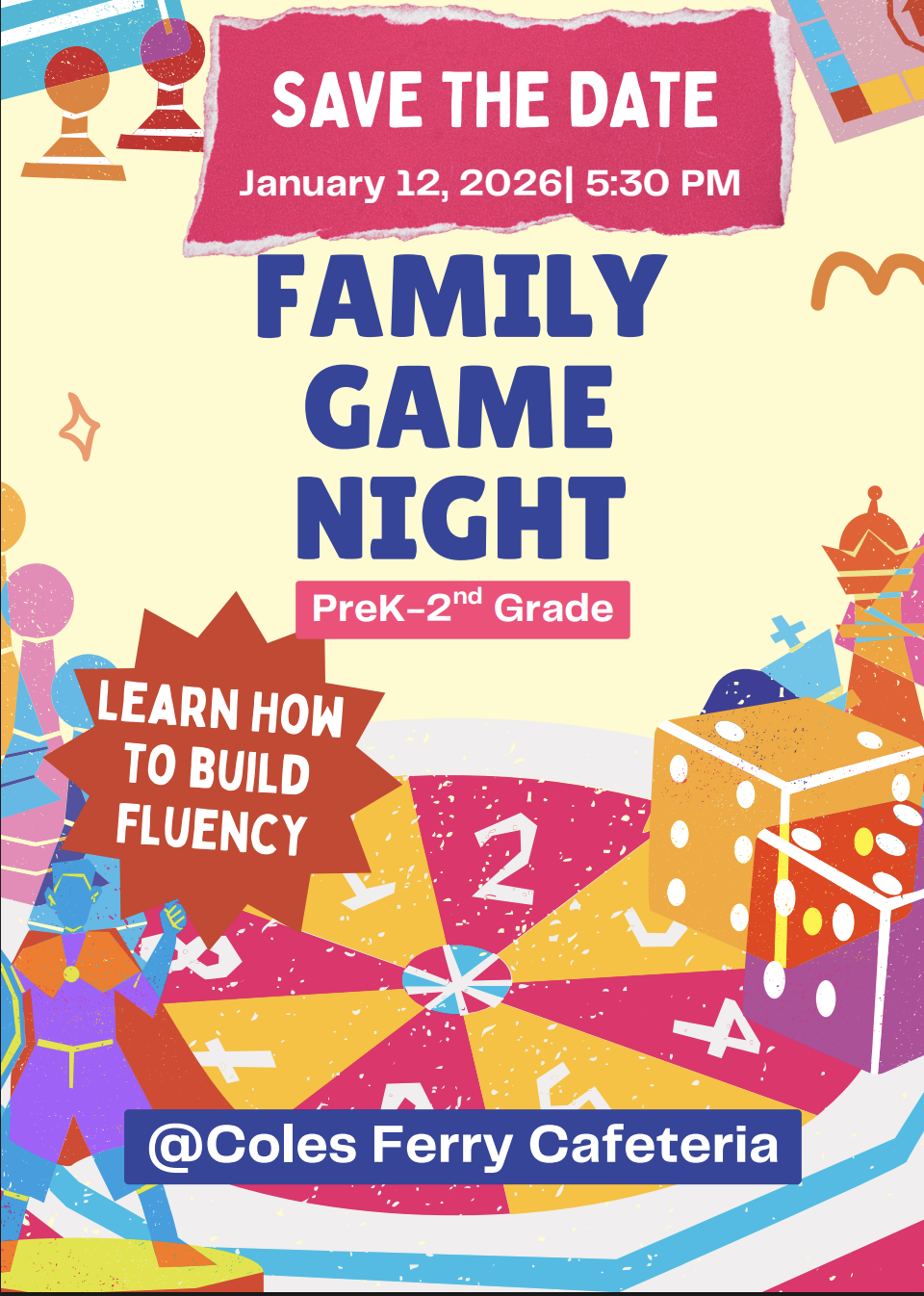 Join us for Family Game Night for our Pre-K - 2nd grade families